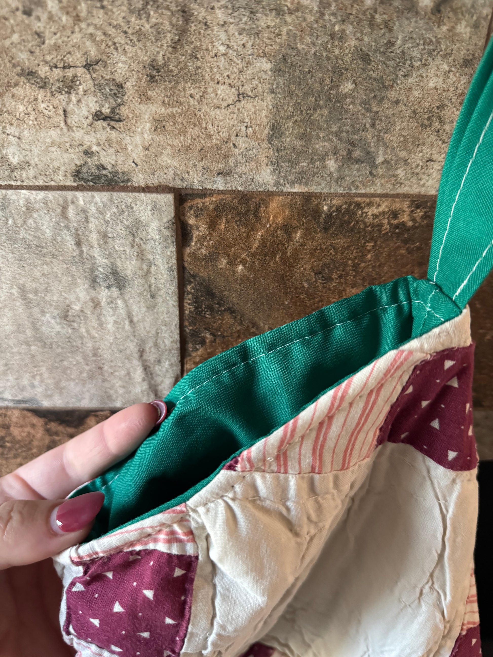Christmas stockings are cut from thrifted quilts I find. I do my BEST to cut around flaws (rips, tears, stains) in the quilt, however sometimes it is inevitable and if I can fix it I do. Quilted stockings are sold AS IS.