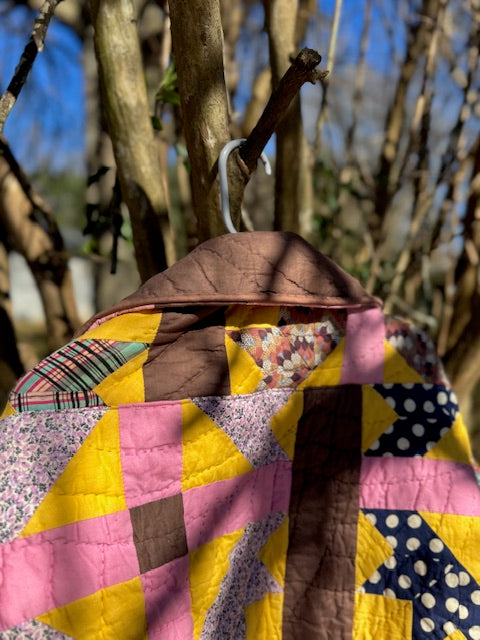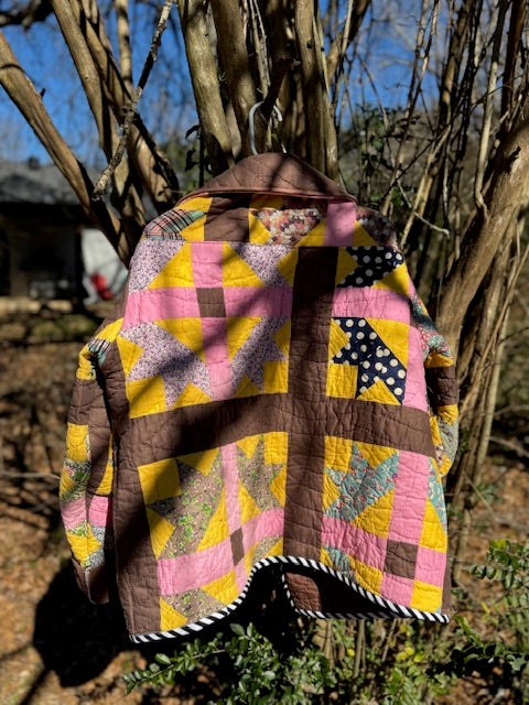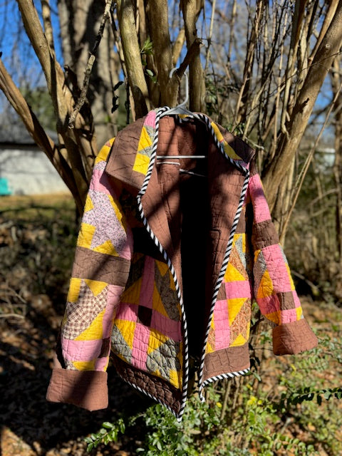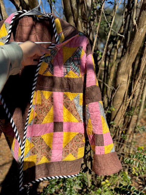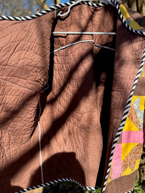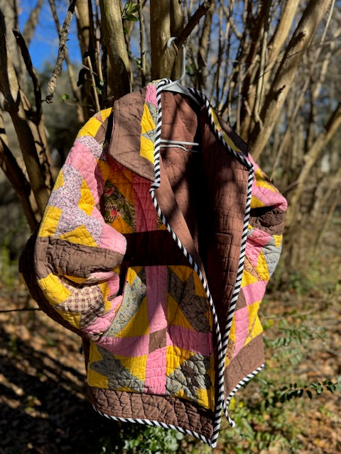I took an old, vintage quilt and turned it into this beautiful, quilted coat! The inside seams are finished with a serger, and the pockets are lined with a pink 100% cotton fabric. The raw edges are finished with 100% cotton bias tape. The size is L/XL, but an overall over-sized fit.